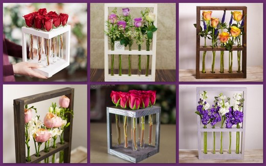 • Интересным решением будет и презент в виде цветов в пробирках на стойках. Особенности данной композиции заключаются в следующем: каждый цветок помещается в индивидуальную колбочку, наполненную питательным раствором для срезки, а потом, вместе с другими цветами, устанавливается на декоративной стойке. В результате цветы становятся одновременно и подароком, и стильным элементом декора.