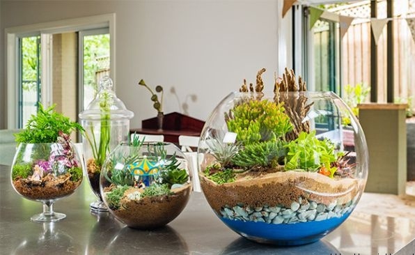 – флорариум (миниатюрный ботанический сад за стеклом – в колбе, в аквариуме или специально изготовленной для этого емкости). Выглядит очень живописно, а ухода особого не требует, так как, преимущественно, во флорариуме используются растения-суккуленты, для роста и развития которых необходимо минимум влаги;