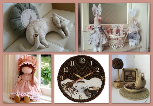 Что подарить? Хорошо впишутся в интерьер куклы Тильды ручной работы, кофейные игрушки, декоративные подушки, композиции из зерен кофе. Интересными станут настенные часы, картины, панно.